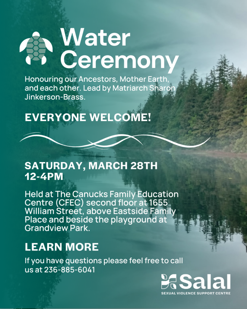 The Water Ceremony will be held in community, where we come together to honour water as life, memory, and medicine. Survivors will take part in the ceremony, offering their prayers, stories, and resilience to the waters while being witnessed and held by the community. This is a sacred act of healing, truth, and renewal.